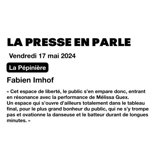 La danseuse Mélissa Guex et le batteur Clément Grin entrent ensemble dans un état instable, là où tout affecte, engage ou précipite. Au milieu des spectateur·rices, elle et il partagent une danse explosive, déraisonnable, généreuse, insatiable, un groove collectif dans les abysses.