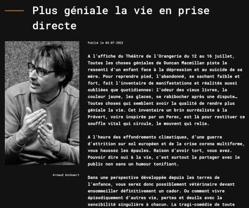 C’est par ce prisme-là, imprégné de toute la chaleur et la mélancolie liées aux souvenirs, que Duncan Macmillan interroge et regarde sans complaisance un sujet délicat : la dépression poussant parfois à l’acte irrémédiable. Dans une proximité essentielle et sensible faite de mille détails, cette partition théâtrale inhabituelle joue finement des fragilités et des imprévisibles interventions du public, invité à être acteur de l’histoire. Un dispositif circulaire qui permet de dépasser le mur qui sépare habituellement artistes et public pour recréer une forme de lien social, de communauté où chacun est partie prenante, tel un écosystème dynamique et créatif.