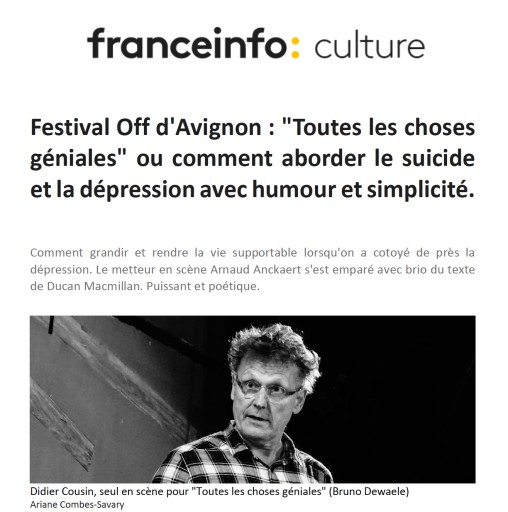 “Un humour vivifiant. On éclate de rire, souvent, et on se surprend à essuyer des larmes au coin des yeux. La pièce ne verse pourtant pas dans le sentimentalisme. Tout est dit avec tact et pudeur.” Ariane Combes-Savary, Franceinfo