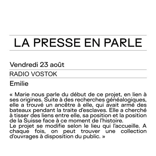 Deux femmes ayant, chacune à sa manière, remonté la trajectoire de bateaux d’ancêtres font résonner ces voyages transgénérationnels, émotionnels et décoloniaux. Cindy Cedeño part de la Colombie à la voile pour se rendre en Suisse, une traversée de l’Atlantique consciente, remontant le courant des bateaux de traite qui avaient déportés ses ancêtres. Marie van Berchem, découvrant l’histoire d’un ancêtre qui avait armé des bateaux d’esclaves au 18e siècle, embarque pour un voyage transformatif avec cet objectif poétique: Je descends d’un vieil arbre encombrant. Je vais prendre son bois et construire un bateau.