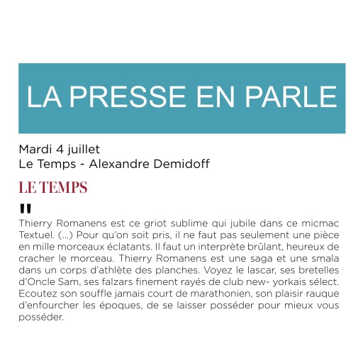 "Le comédien suisse est magistral dans une saga sur les magnats de la finance, une pièce électrisante de Stefano Massini" (...) "Le spectacle est grandiose" Le Temps