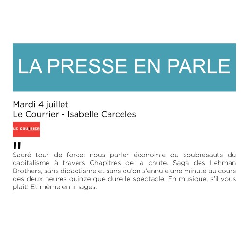 "Sacré tour de force: nous parler économie ou soubresauts du capitalisme à travers Chapitres de la chute. Saga des Lehman Brothers, sans didactisme et sans qu’on s’ennuie une minute au cours des deux heures quinze que dure le spectacle. En musique, s’il vous plaît! Et même en images" Le Courrier