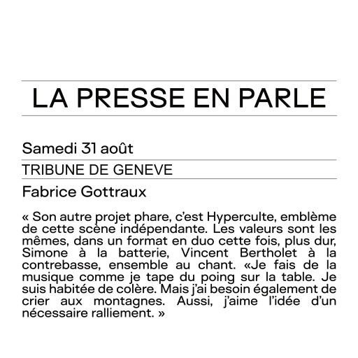 "16h30, à l’Ubu on se transporte en Helvétie avec 3 formations transalpines. Le premier set est plus que gagnant avec le duo Hyperculte. Les 2 Suisses sont redoutables, en 40min chrono ils te livrent un colis musical transcendantal. Une fille à la batterie et au chant, un gars avec sa contrebasse diantrement torturée . Ils mettent le feu très vite dans cette petite salle mythique des Trans, créant une transe hypnotique à force de tourneries hypnotiques entre rythme tribal, poésie lunaire, électro transcendantale, expérimentations new wave technoïdes et post rock punk... tout cela ensemble. L’instant est magique, avec une folie pleine de grâce et contagieuse, le public est conquis, ce duo nous a transportés ailleurs higher."
