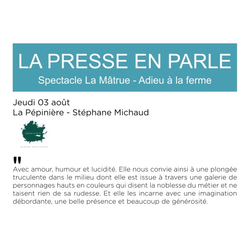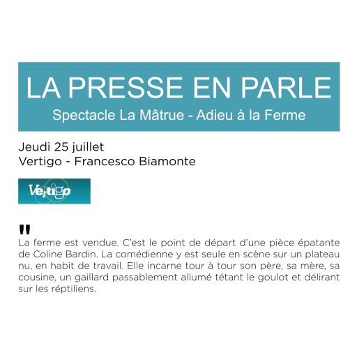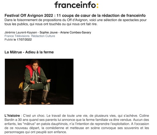" La Mâtrue - Adieu à la ferme, un portrait drôle et sensible, une histoire personnelle où résonnent les bruissements d’un monde plus grand.", Fip, Charlotte Bibring" Le verbe haut, la présence impayable et l’imagination débordante, Coline Bardin explose littéralement sur scène. Sans contexte, une des belles révélations de ce Off 2022 ! ", L'oeil d'Olivier, Olivier Frégaville-Gratian d’Amore