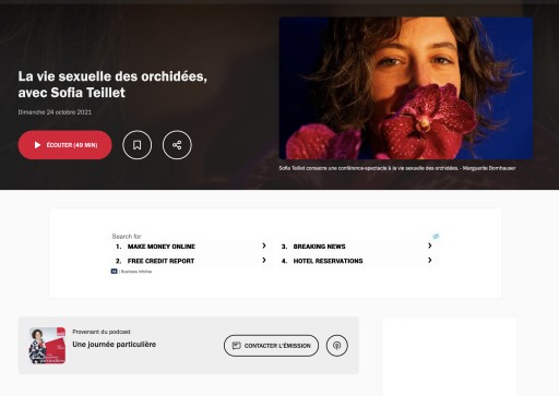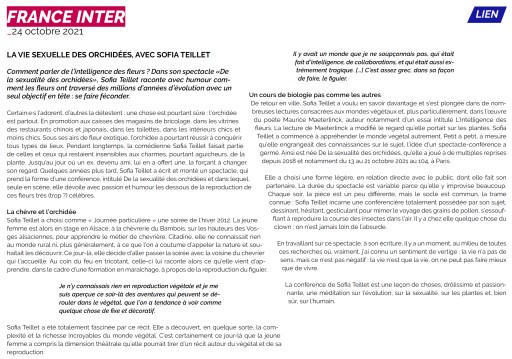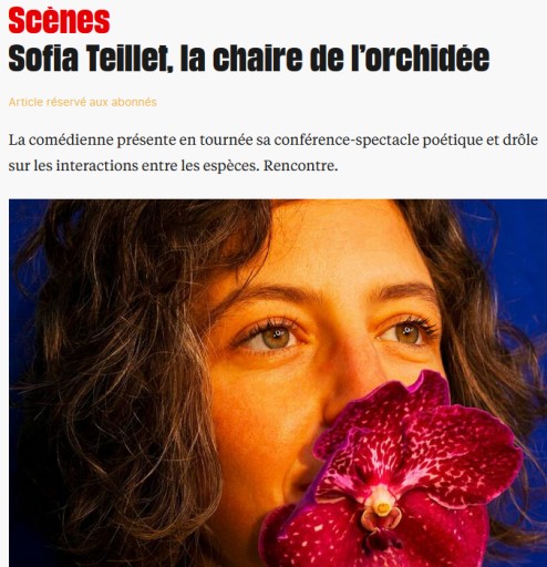 À la suite d’éminentes recherches, la délicate et solaire Sofia Teillet s’est passionnée pour ces plantes mystérieuses et voluptueuses. À sa table de conférencière, accompagnée de l’indispensable paperboard et d’un vidéoprojecteur, elle ravive nos vieux souvenirs de biologie, à mi-chemin entre la conférence scientifique et le one woman show décalé. Très documentée, avec beaucoup d’humour, elle plonge au coeur du sujet et le travaille au corps. De doubles sens en sous-entendus, sa conférence-spectacle est une occasion détournée d’observer notre propre façon d’être au monde.
