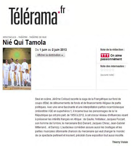 "Avec une verve fascinante et une interprétation parfois rocambolesque, Jérôme Colloud incarne tous les personnages de la vème république qui ont pris part, depuis 1952, à cet obscur réseau d'influences visant à préserver les intérêt français en Afrique" - Télérama - Thierry Voisin