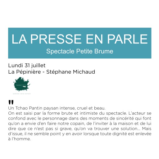 "Un Tchao Pantin paysan intense, cruel et beau. On est saisi par la forme brute et intimiste du spectacle. L’acteur se confond avec le personnage dans des moments de sincérité qui font qu’on a envie d’en faire notre copain, de l’inviter à la maison et de lui dire que ce n’est pas si grave, qu’on va trouver une solution… Mais d’issue, il ne semble point y en avoir lorsque toute dignité est enlevée à l’homme." - La Pépinière