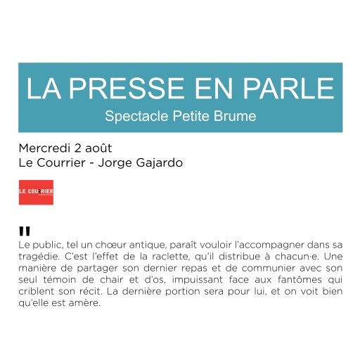 "Le public, tel un chœur antique, paraît vouloir l’accompagner dans sa tragédie. C’est l’effet de la raclette, qu’il distribue à chacun·e. Une manière de partager son dernier repas et de communier avec son seul témoin de chair et d’os, impuissant face aux fantômes qui criblent son récit. La dernière portion sera pour lui, et on voit bien qu’elle est amère." - Le Courrier