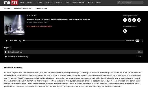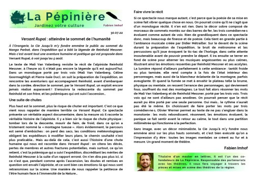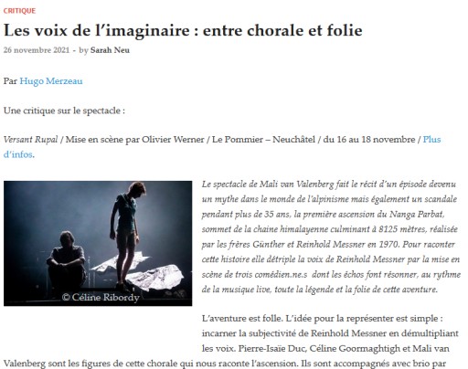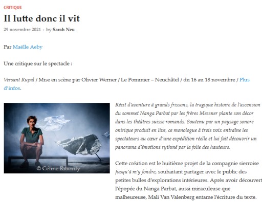 "L’expérience proposée par la compagnie Jusqu’à m’y fondre, hantée par l’authenticité des faits, saisit par sa capacité à nous transporter dans le vif de l’expédition. Parole d’une novice de l’alpinisme : on ne peut qu’être emporté par la puissance d’une histoire aussi bien racontée." - L'Atelier critique